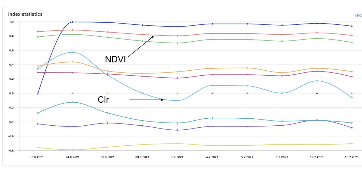 As you see in the picture above, the NDVI index does not react to stress about 01 July, but the Chlorophyll Red index shows a local minimum at the time of disaster.